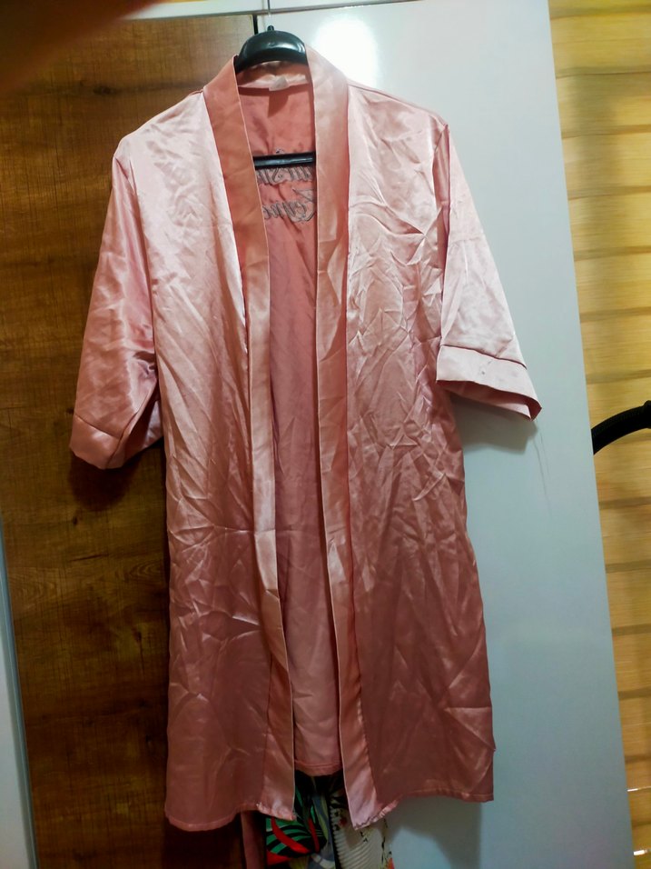 Yumuşak ve pastel pembede, kısa kollu, sade desenli, bol kesim midi kadın sabahlık. Bohem Paris tarzı. brides
