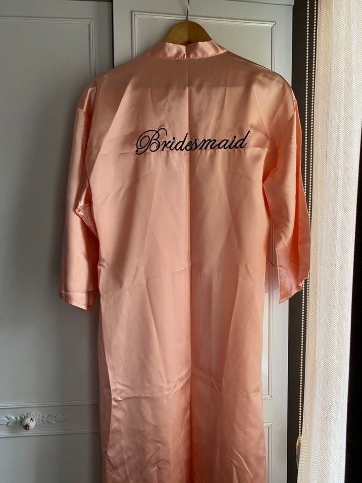 Kısa kollu, midi boy ve regular fit pembe parlak kumaştan kadın sabahlık. Arkasında "Bridesmaid" yazısı bulunur. Minimalist ve klasik tarzda.