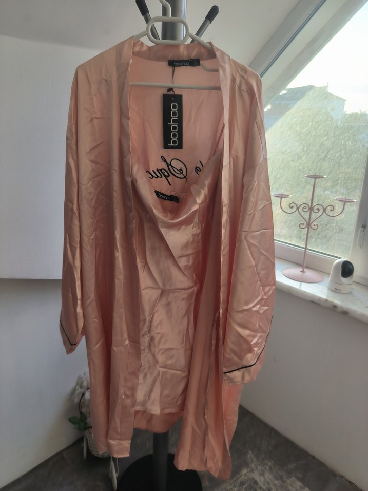 Pembe parlak saten kumaştan, baskılı ve askılı kollu, bol kesim midi sabahlık, Paris esintili sokak stilini yansıtıyor. hiç kullanılmamıştır E-Ticket üzerinde 2 parça dir