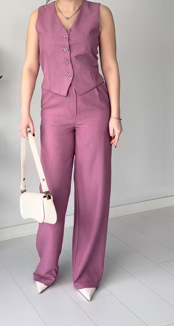 Pembe renkli kadın takımı, yakası kesik ve askılı kollu, normal kesim ve kemerli tasarımla modern ofis stiline uygun. Sentetik kumaştan, desensiz ve rahat.