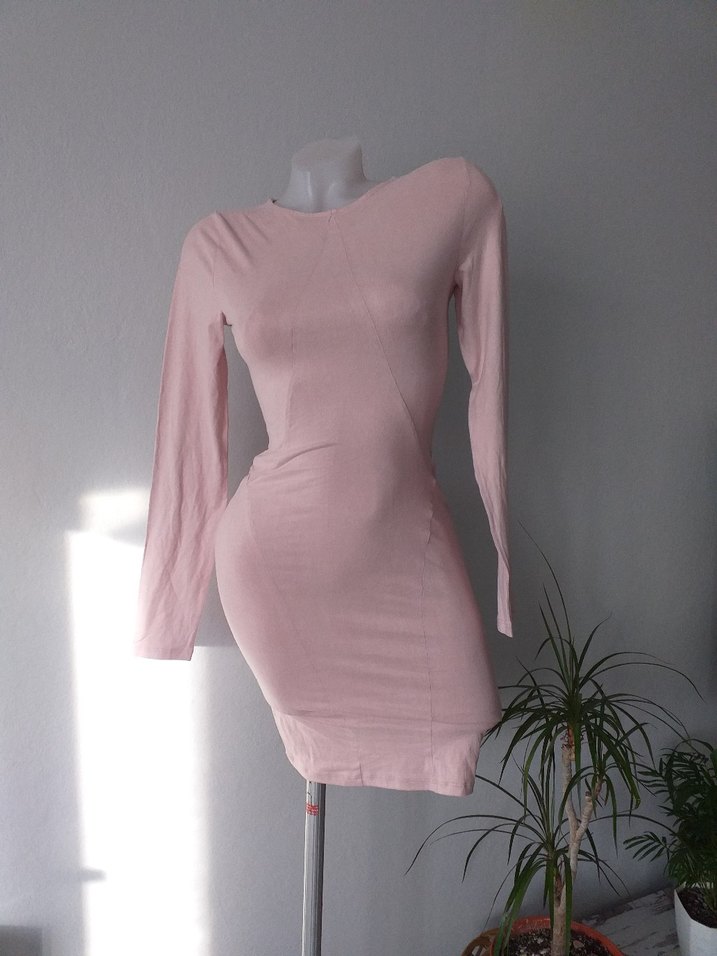 Pembe renkli, uzun kollu, yuvarlak yakalı, vücuda oturan midi triko elbise. Yumuşak sentetik kumaştan, minimalist ve şık tasarım, günlük kullanım için uygundur.