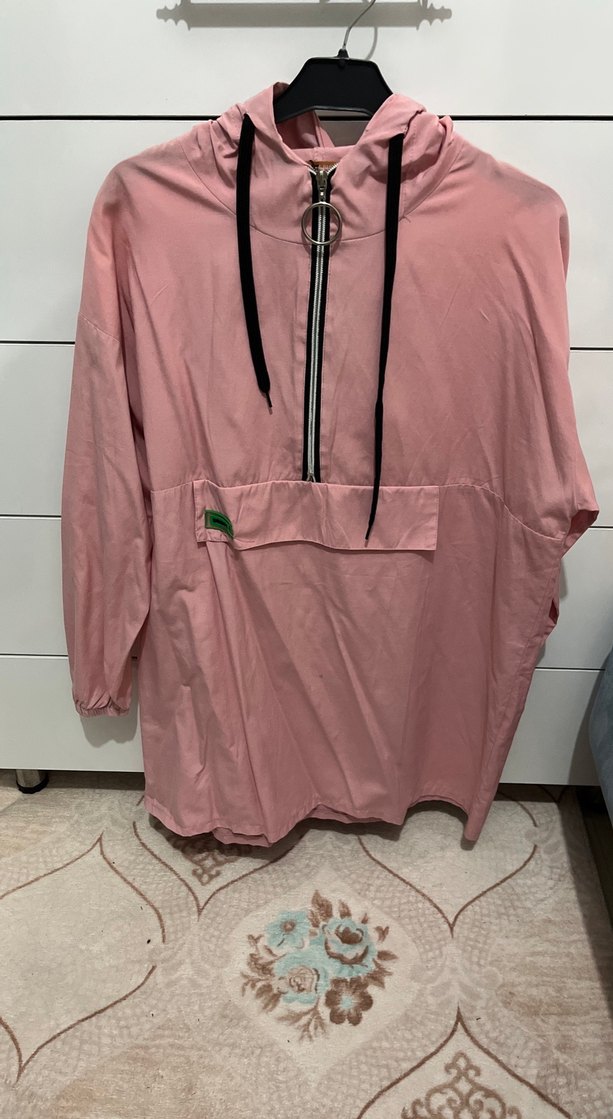 Uzun kollu, yüksek yakalı, fermuarlı pembe midi kadın yağmurluğu. Rahat kesimi ve kapüşonuyla günlük sokak tarzına uygun. ️