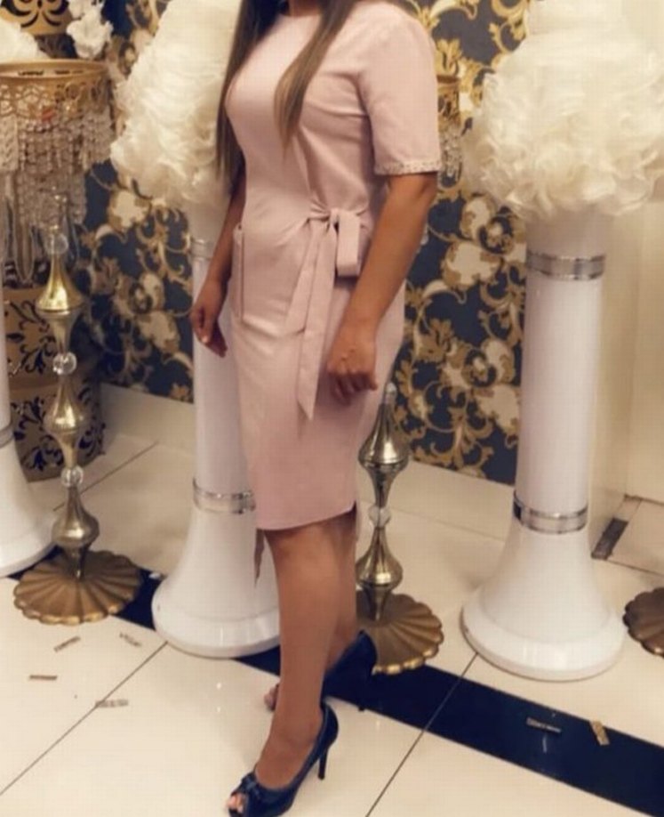 Pastel pembe midi elbise, V yaka ve kısa kolludur. Kemer detaylı ve hafif yılan derisi desenine sahiptir. Ofis için uygun, rahat kesim.