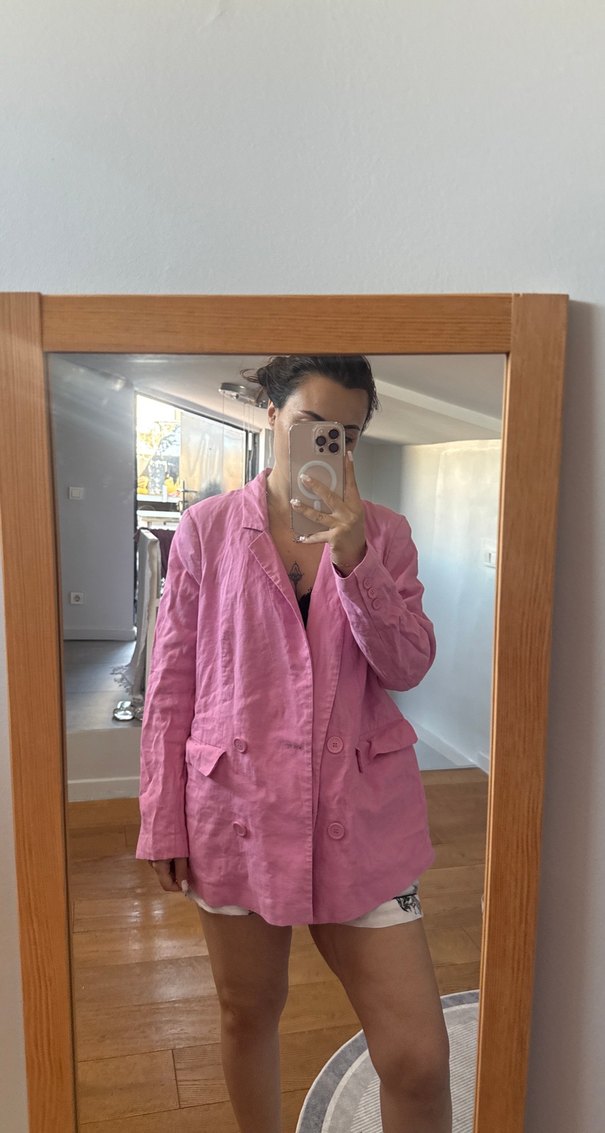 Pembe keten kumaştan, düğmeli ve notched yakalı, uzun kollu, bol kesim midi blazer ceket. Minimalist tarzda, günlük kullanıma uygun.