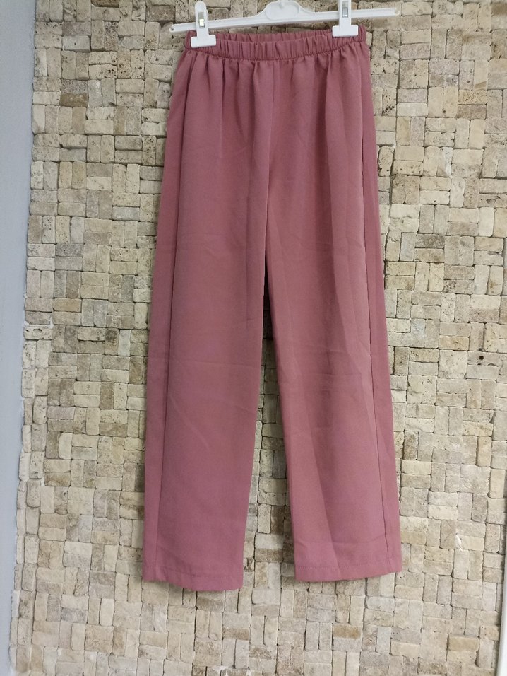 Pastel pembe renkte, keten kumaştan, midi boy ve rahat kesim, lastikli bel detaylı kadın pantolonu. Minimalist ve zahmetsiz şıklık sunar. L/XL Beden %100 polyester uzunluk 94 cm
