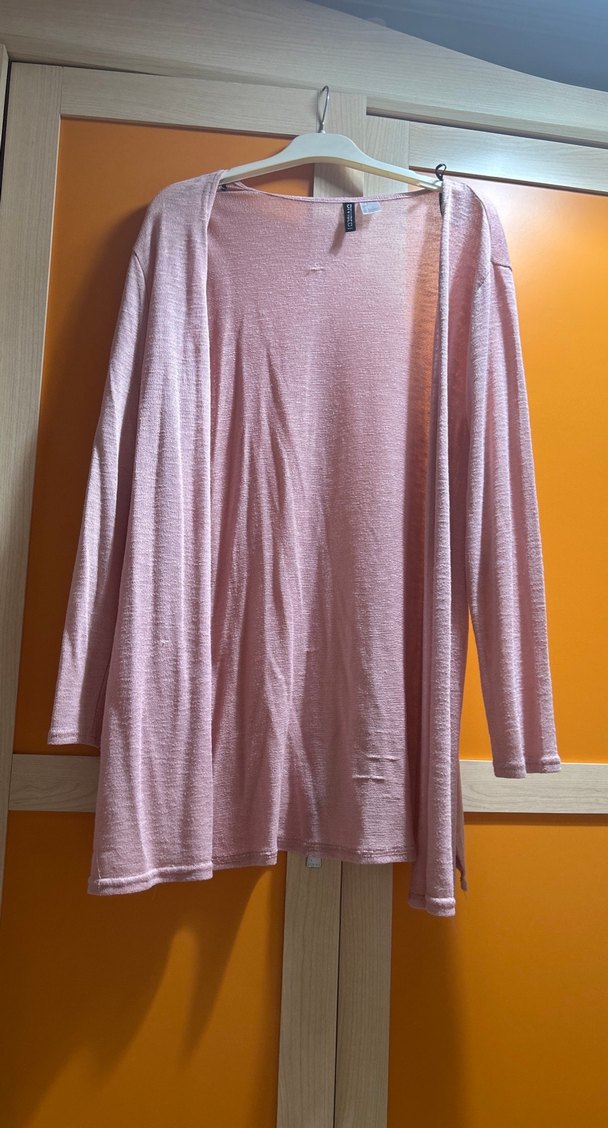 Pembe keten kumaştan, uzun kollu, salaş ve dökümlü midi boy hırka. Yuvarlak yakalı, desensiz yapısıyla günlük kullanıma uygundur.