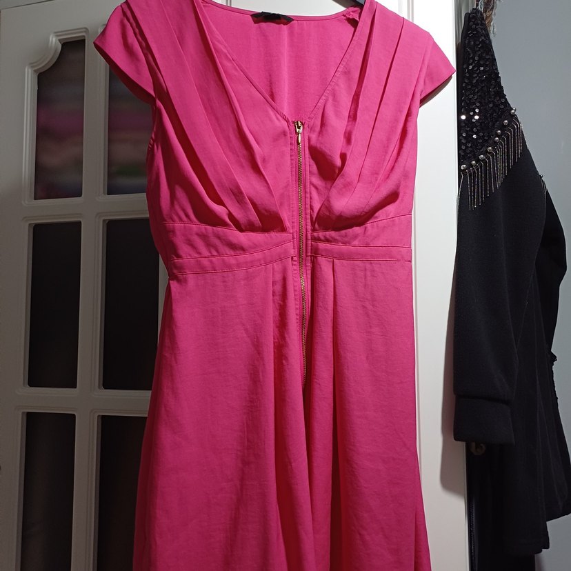 Parlak pembe renkli, V yakalı ve önden fermuarlı, keten kumaştan yapılmış, kolsuz ve vücuda oturan midi elbise. Romantik akşamlar için uygundur.