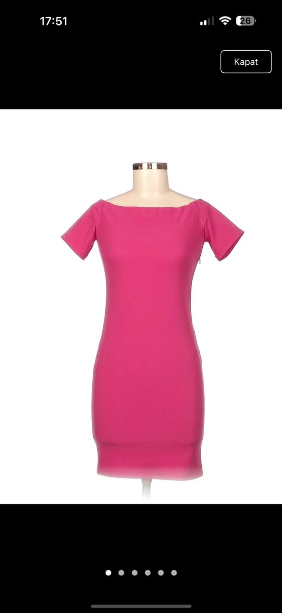 Pembe midi elbise, kısa kollu ve tekne yaka detaylıdır. Düz ve şık tasarımı ofis için uygundur, sentetik kumaştan üretilmiştir.