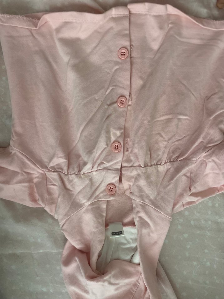 Pastel pembe renkte, V yakalı, kısa kollu ve bol kesim midi uzunlukta lohusa sabahlığı. Ön kısmında düğmeler bulunur, rahat ve kullanışlıdır.