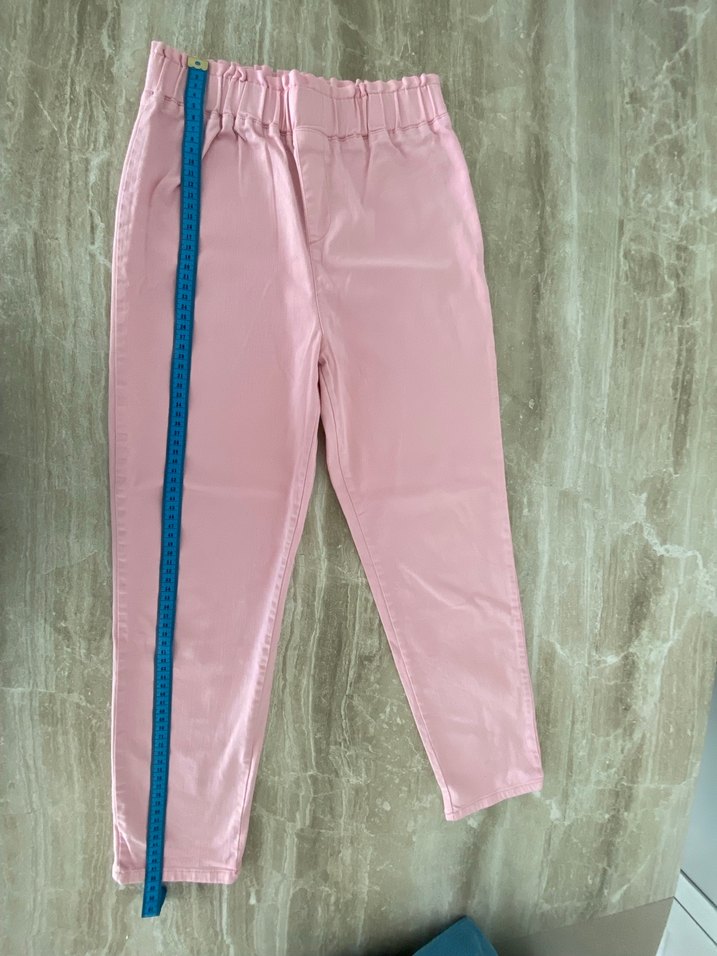 Pastel pembe renkli, elastik bel bantlı, yumuşak sentetik kumaştan üretilmiş, günlük kullanıma uygun normal kesim kadın pantolon.