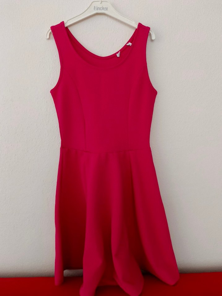 Kolsuz, bisiklet yakalı pembe midi elbise, oturan üst ve genişleyen etek ile çağdaş ve minimalist tarzda, rahat sentetik kumaştan.