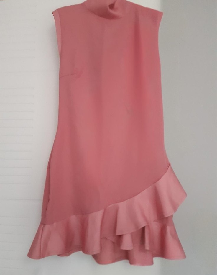 Yüksek yakalı, pembe midi elbise, kolsuz ve etek kısmında fırfır detayıyla, rahat kesim sunar.