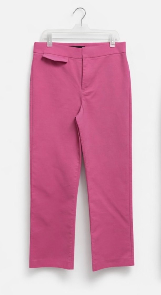 Pastel pembe renkte, normal kesim ve midi boyda, minimalist tarzda, düz desenli, sentetik kumaştan yapılmış kadın pantolonu. Ofis için uygun.