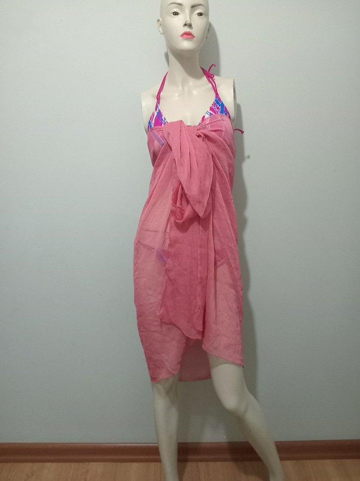Pembe midi uzunlukta, salaş ve drapeli pareo. Kolsuz, pastel tonlarda batik desenli, cesur bohem tarzda, plaj için uygun.