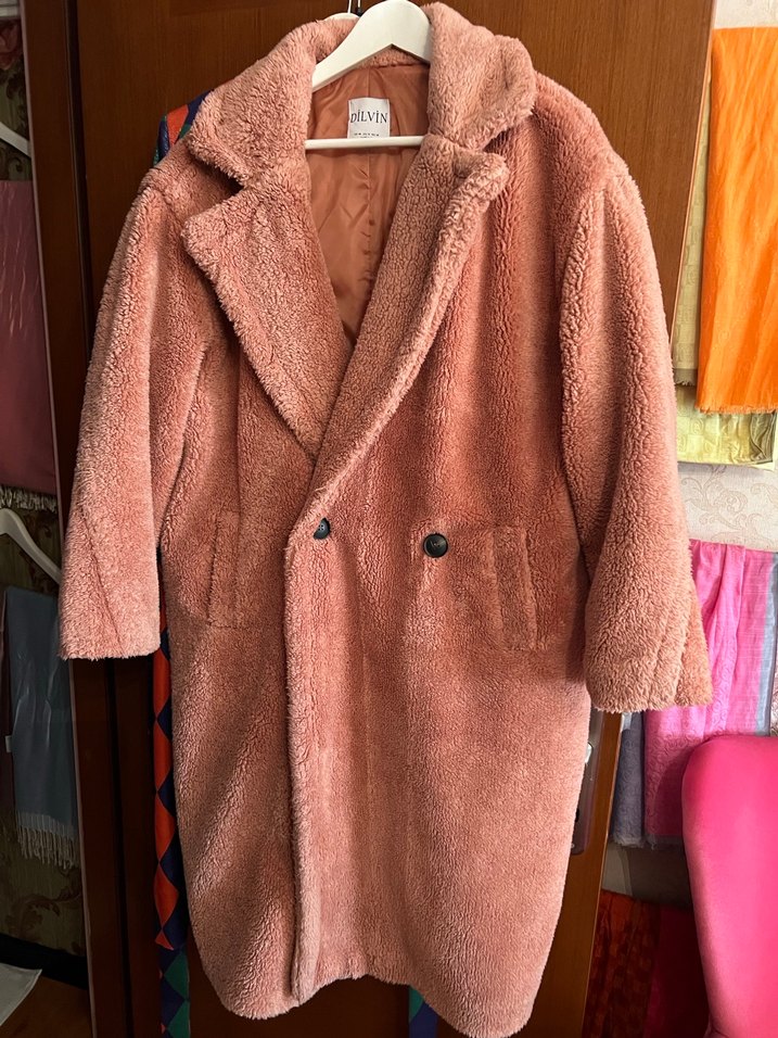 Pastel pembe renkte, kürk detaylı, uzun kollu, normal uzunlukta ve bol kesim kadın kaban. Yumuşak ve sıcak kumaştan, güncel sokak modasına uygun. 40 beden