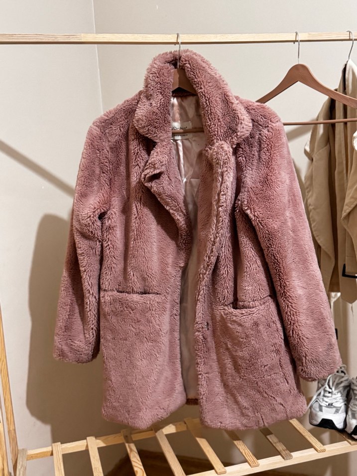 Pembe midi uzunlukta, yumuşak ve sıcak peluş kumaştan yapılmış, kürk detaylı kadın kaban. Notch yaka, uzun kollu ve bol kesimdir, trend sokak stili için uygundur.