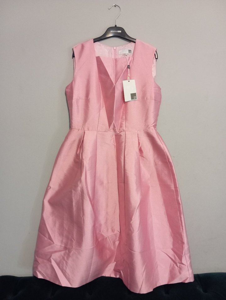 Pembe midi elbise, kolsuz ve V yaka tasarımla, pilili etek ve rahat kesime sahip. Düğünler için uygun, yumuşak pastel tonlarda.