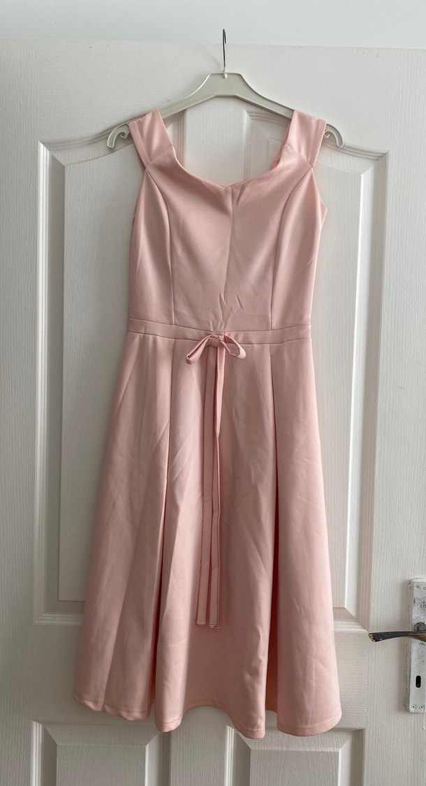Pastel pembe midi uzunlukta, V yakalı omuzları açık elbise hiç bir sıkıntısı yoktur iki kere giyilmiştir