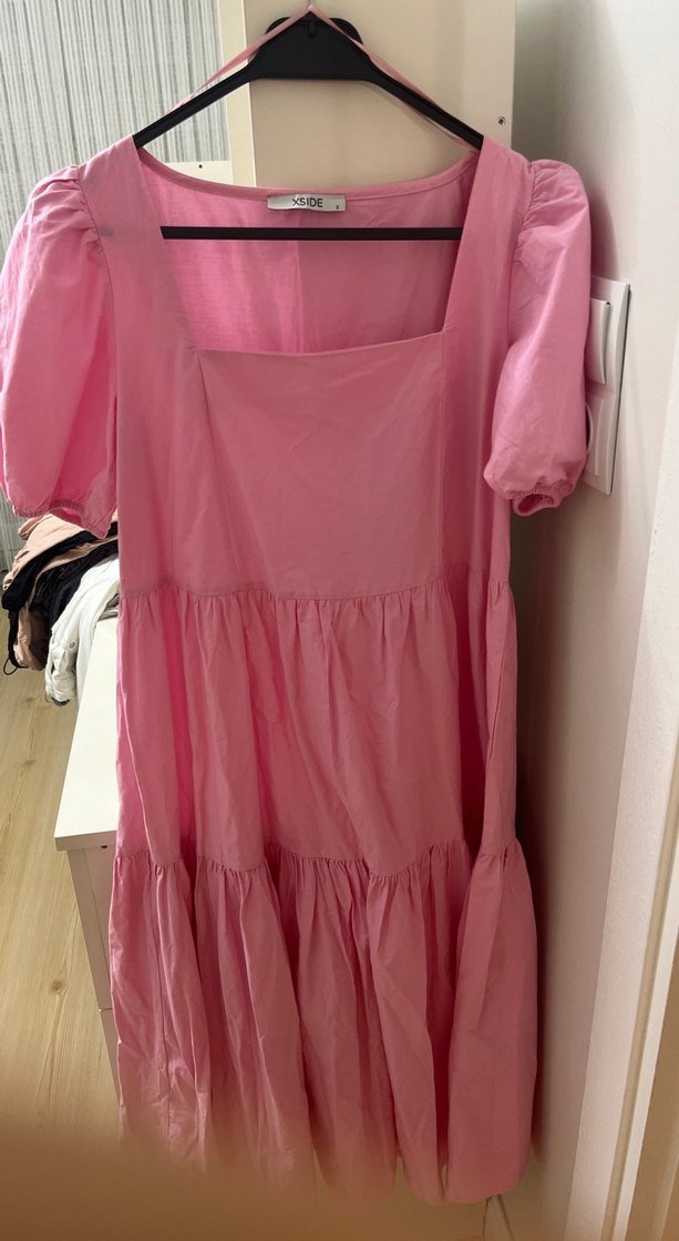 Pastel pembe renkli, salaş kesim midi elbise. Fırfır detaylı, askılı ve tek renk, tekne yaka ile rahat sentetik kumaştan.
