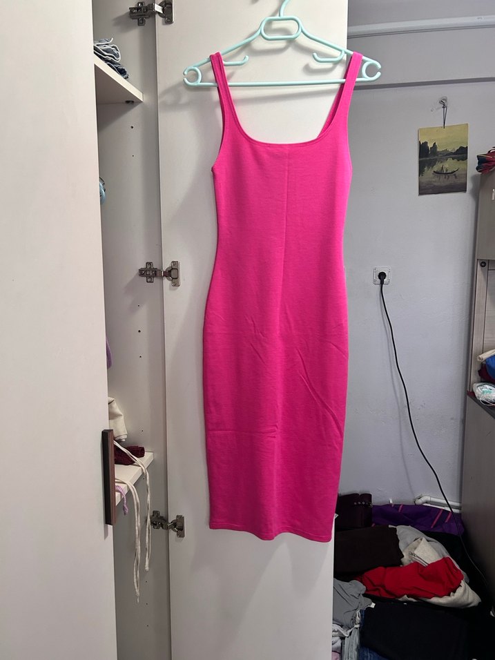 Pembe, sade, midi uzunlukta, askılı ve vücuda oturan kadın elbisesi. Yumuşak sentetik kumaştan, minimal ve rahat şıklık sunar.