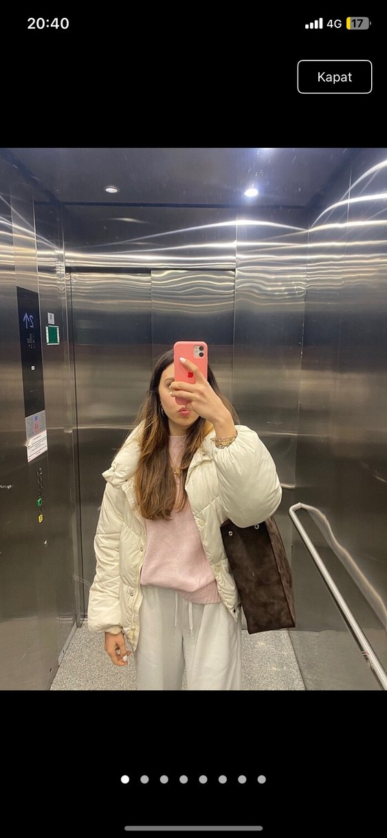 Pastel pembe renkli, midi boy kadın mont yüksek yakalı ve uzun kolludur. Rahat kesimli, şişme detaylı ve yumuşak, sıcak dokulu kumaştan yapılmıştır. elyafları yıkadığım için kaydı fotoğraf mevcurt