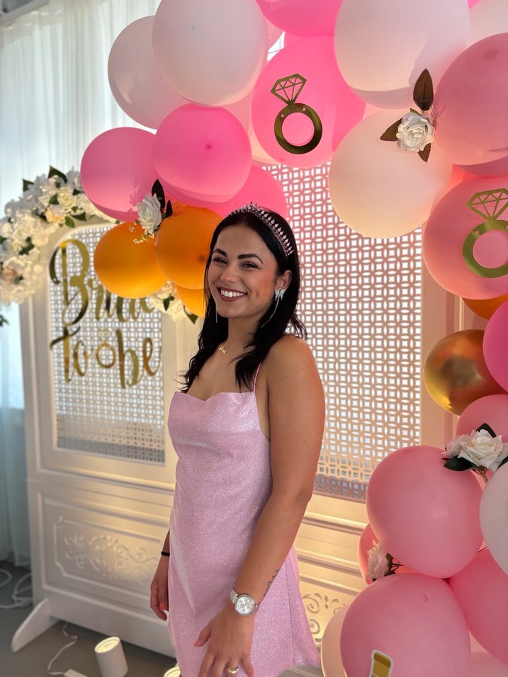 Pembe midi boy, straplez ve askılı kollu, boncuk işlemeli batik desenli, dar kesim elbise. Cesur ve gösterişli parti stiline uygun.