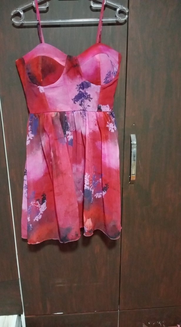 Pembe bağlama desenli, straplez ve drapeli midi elbise. Sentetik kumaştan, kolsuz ve vücuda oturan kesimiyle romantik buluşmalar için ideal.