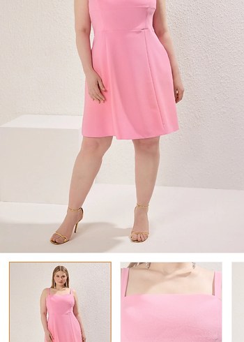 Pembe midi elbise, dar kesim, askılı kollu ve tekne yaka ile modern ofis tarzı sunar. Minimalist tasarım, zahmetsiz şıklık sağlar.