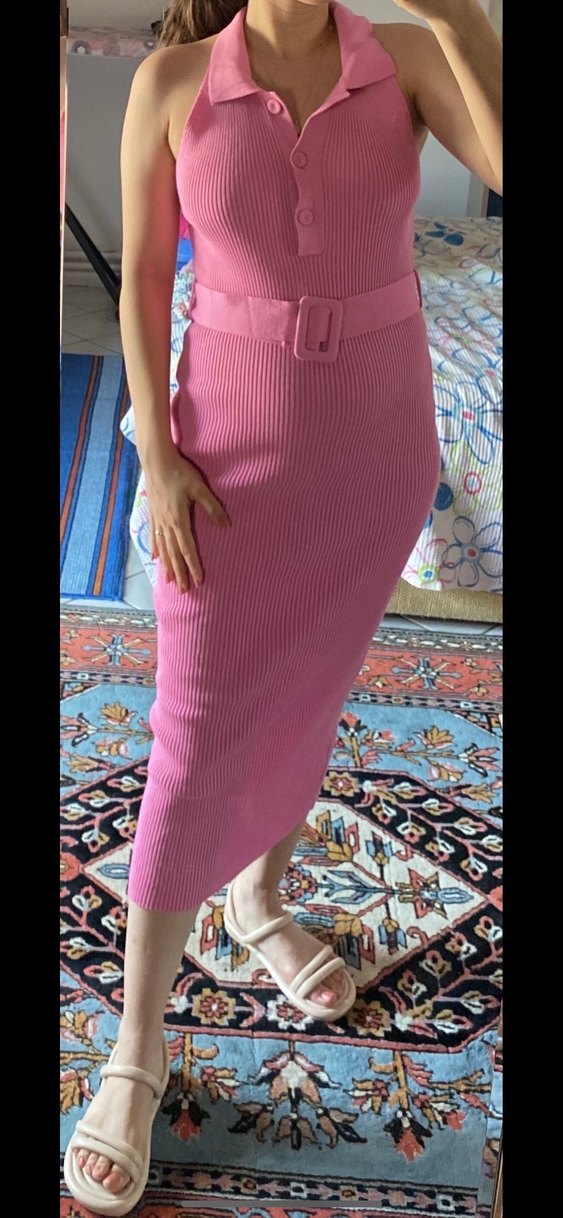 Pembe Midi Triko Elbise Kemerli