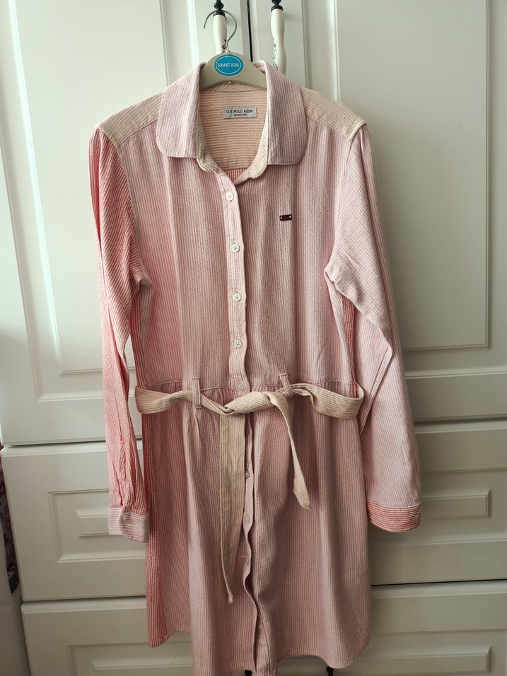 Pastel pembe keten gömlek elbise, uzun kollu, düğmeli ve yakalıdır. Belden bağlamalı, bol kesim ve renkli cizgilidir 10-11 yaş