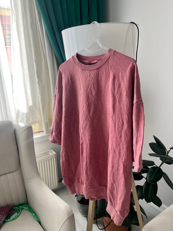 Pembe midi uzun kollu sweatshirt, salaş kesim ve yuvarlak yaka ile rahat bir stil sunar. Yumuşak keten kumaştan, gündelik kullanım için konforludur. Desensiz ve pastel tonlardadır.