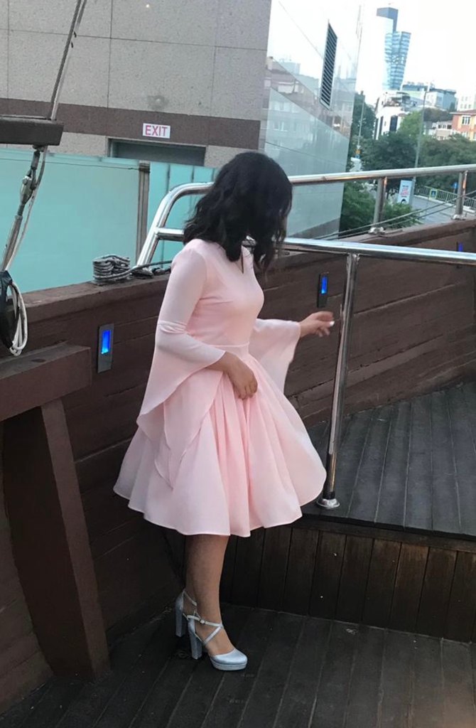 Özel dikim elbise Boy:90cm Pembe pastel renginde, uzun kollu, pile detaylı, V yakalı, transparan kol detaylı, midi boy ve vücuda oturan ipeksi kumaştan elbise
