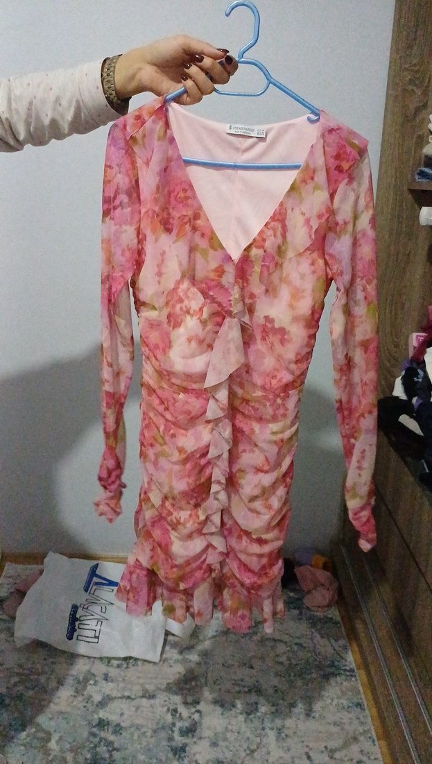 V yaka, uzun kollu, drapeli kesime sahip, pembe tonlarında tie-dye desenli, midi boy, fit kesim elbise. Yumuşak sentetik kumaştan yapılmıştır. Hic kusuru yok on numara