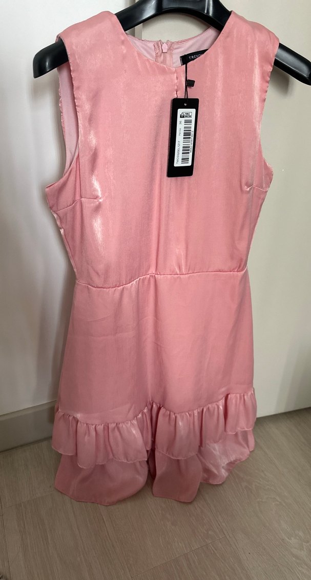 Kolsuz, pembe midi elbise, v yaka ve etek ucunda fırfır detaylıdır. İnce pastel tonu ve dar kesimiyle romantik akşamlar için uygundur.