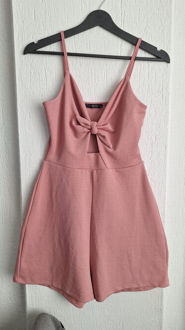 Pembe mini tulum, ince askılar, V yaka ve önünde fiyonk detayına sahiptir. Bel kısmı oturur, kısa boylu ve yumuşak sentetik kumaştan yapılmıştır.