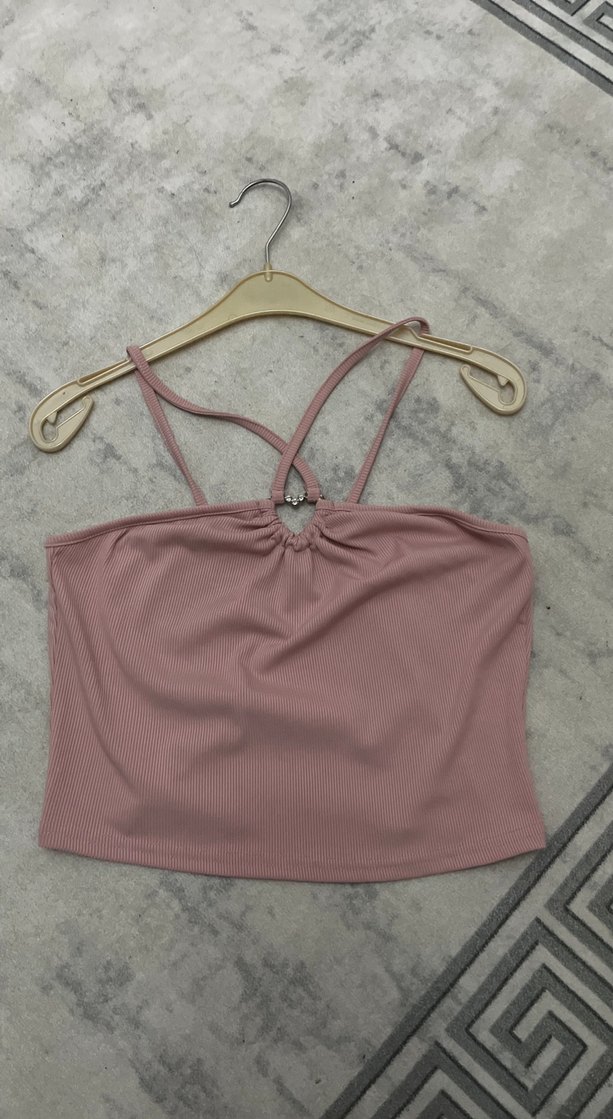 Pembe renkli, askılı ve straplez tasarımlı, halka detaylı mini kadın atlet. Pürüzsüz sentetik kumaştan, trend sokak stili için uygun.