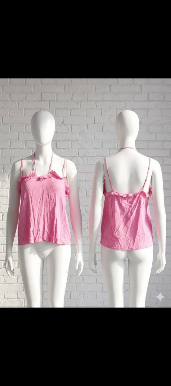 Pembe pamuklu, askısız ve kolsuz, bol kesim mini kadın atlet. Günlük sokak stili için uygundur. S/M beden uyumludur.