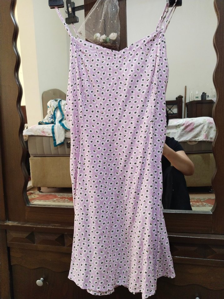 Gevşek kesim, drapeli midi elbise, pastel pembe batik desenli ve V yakalı. Askılı, yumuşak sentetik kumaştan, günlük sokak tarzı için uygun.