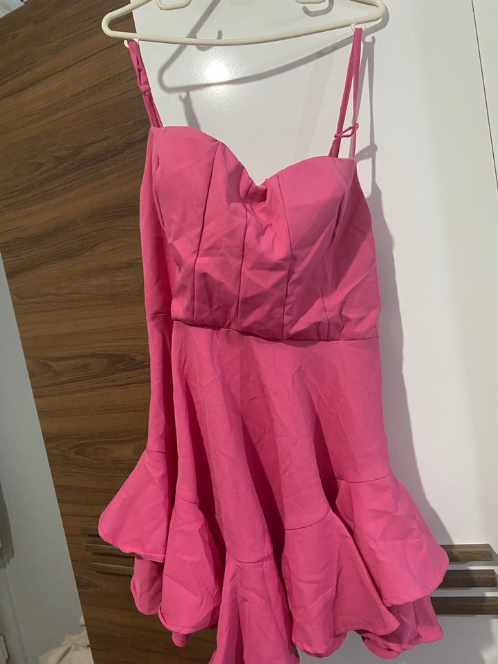 Pembe mini abiye elbise, askılı ve straplez yakaya sahip. Volan detaylarıyla cesur ve bohem bir tarz sunar. Parti için uygundur. Hurçta biraz kırıştı ütülü yollanacaktır . Bir defa giyildi . Defosu yoktur