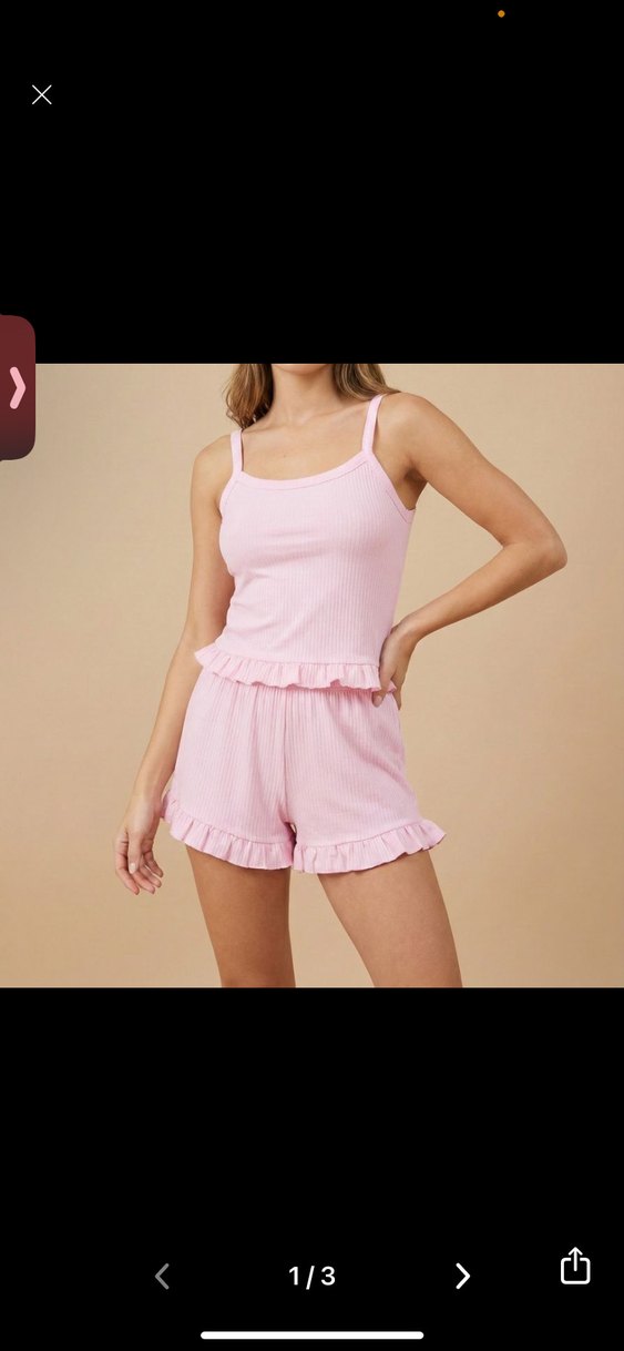 Pembe, mini şortlu ve fırfırlı detaylı, atlet kesim, vücuda oturan rahat kumaştan kadın pijama takımı.