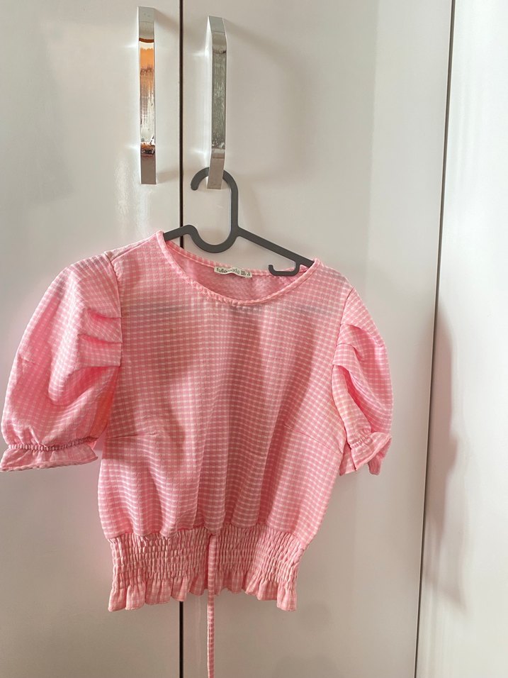Pembe mini bluz, kısa kollu, yuvarlak yaka ve düğmeli detaylara sahip. Pamuklu yumuşak kumaştan, pastel tie-dye deseniyle günlük sokak stiline uygun.