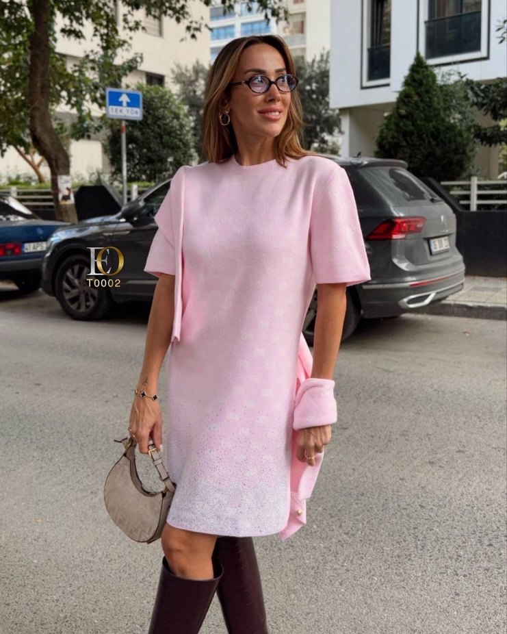 Pembe renk, kısa kollu, yuvarlak yakalı, bağlama desenli ve dantel detaylı, rahat kesim mini triko elbisedir. Günlük kullanıma uygundur.
