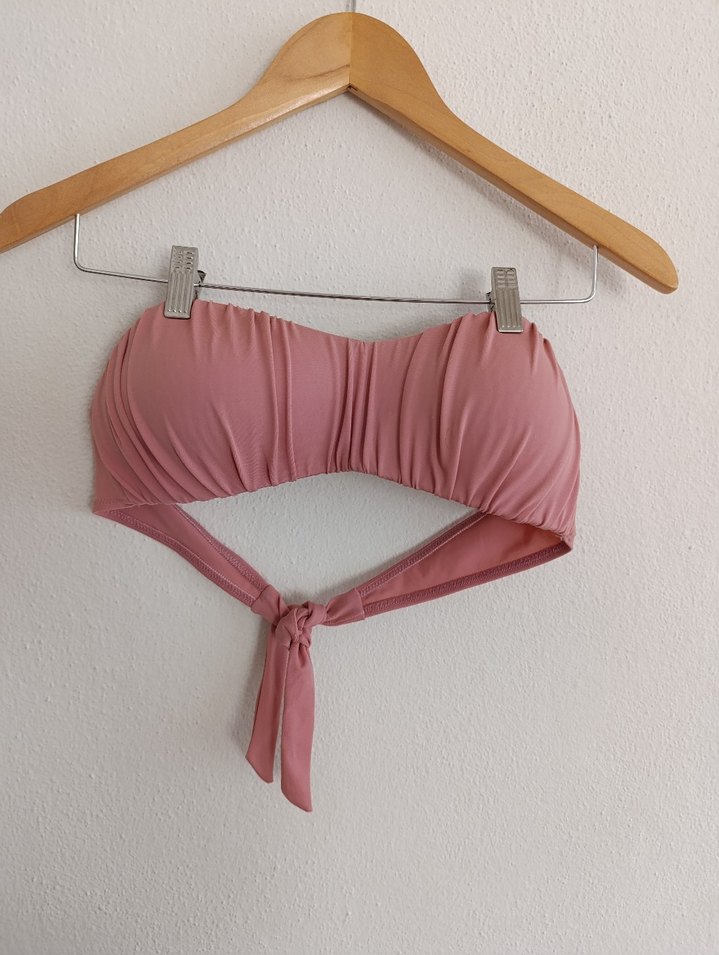 Pastel pembe renkte, kısa kesim ve bağlamalı detaylı, desen içermeyen minimal ve bohem tarzda bikini üstü.