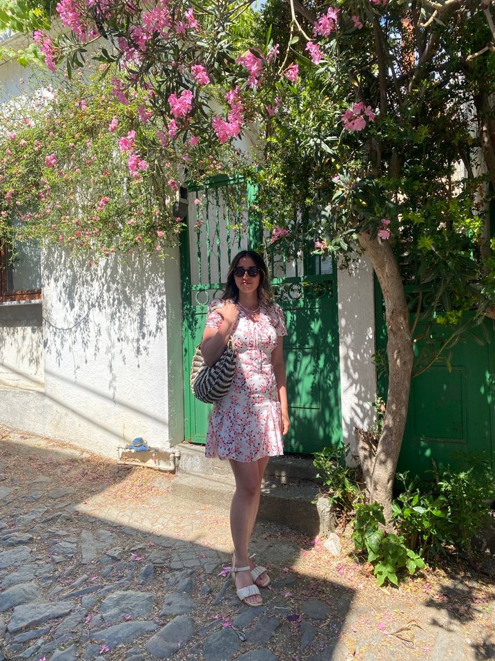 Beyaz üzerine pembe çiçekli mini elbise, pastel tonlarda tie-dye desenli. Kısa kollu ve V yakalı, pamuklu yumuşak kumaştan, açık hava için uygun.