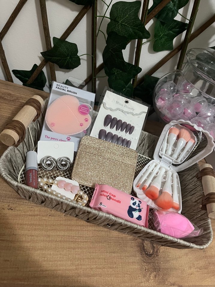 Küpe - çanta boy mat ruj - pens toka - yüz yıkama aparatı - takma tırnak - makyaj fırça seti - sünger - simli kartlık - ıslak mendil