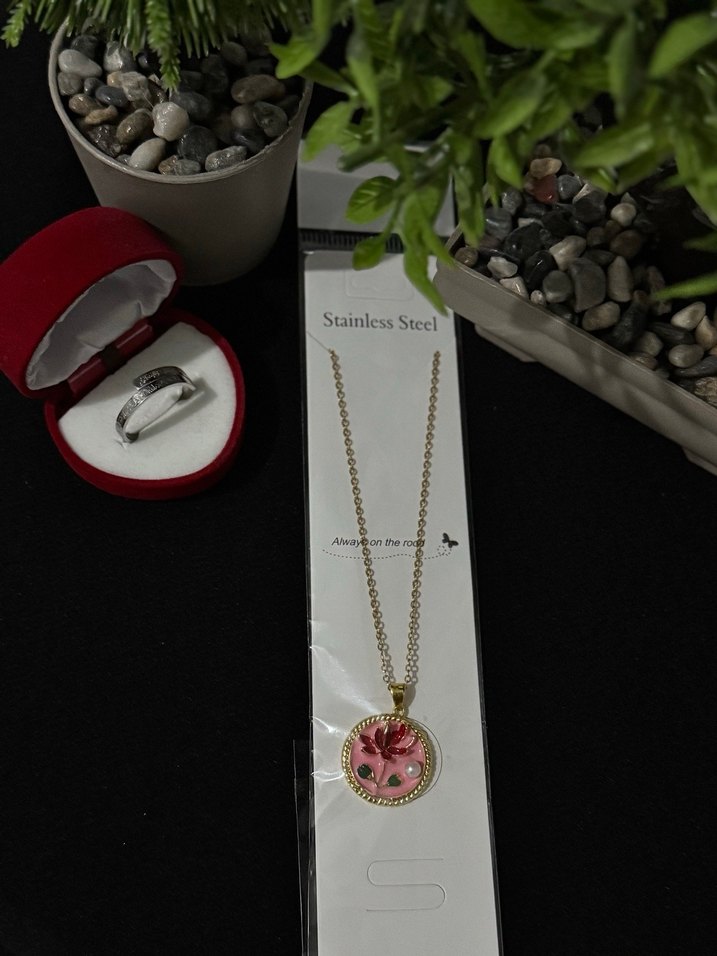 Orta uzunlukta, zincir detaylı ve pembe desenli bohem tarzı kadın kolyesi. Paslanmaz çelikten üretilmiştir, minimalist günlük kullanıma uygundur.