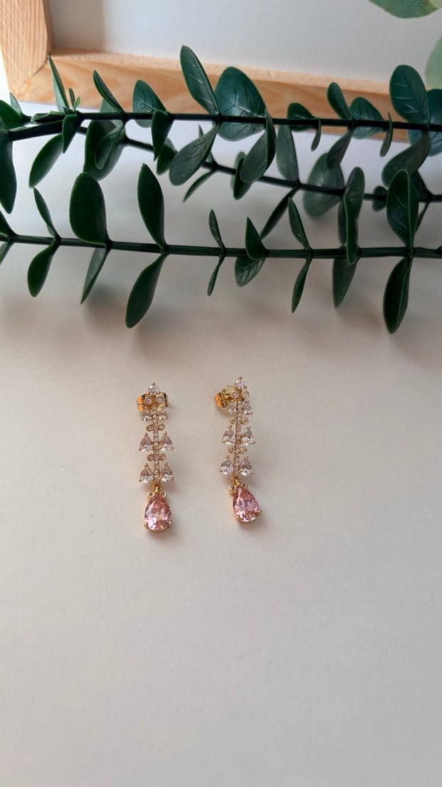 Kısa uzunlukta, pembe boncuklu çiçek detaylı modern klasik tarzda, düğün için uygun zarif küpeler. Klasik zarafeti yansıtır.