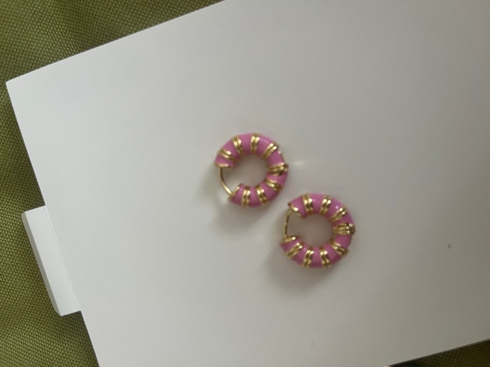 Renkli çizgili boncuk detaylı pembe mini halka küpeler, romantik akşamlar için bohem tarzda.