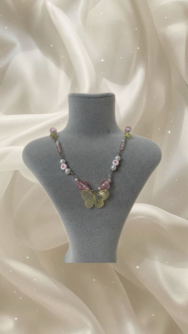Pembe pastel tonlarında, kelebek detaylı, mini uzunlukta boncuklu kolye. Nakış desenleriyle bohem tarzını yansıtıyor.