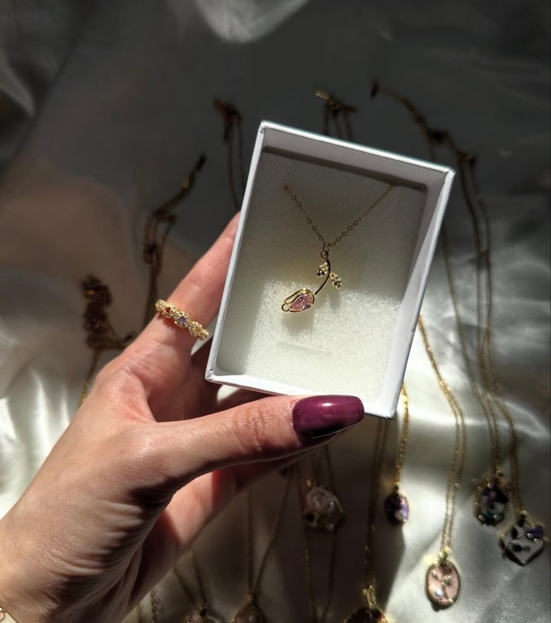Kısa uzunlukta, pembe boncuklu ve baskılı detaylı mini kolye. Minimalist ve klasik şıklığı romantik akşamlar için tamamlar.